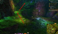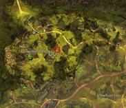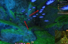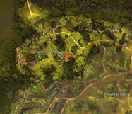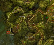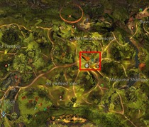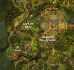 This is a jumping puzzle in the golem chess cave west of the Falls near the Hero Challenge. It is only accessible viaLey Line gliding or mesmer port if someone completed it and is willing to port you up. To get to the start of the jumping puzzle, you will need to use bouncing mushrooms at the indicated position on the map. Once you get up on the area with the bouncing mushrooms, you can get to the golem cave either via ley line gliding or you can cheese itwith just lean gliding. However keep in mind that the actual puzzle requires Ley Line Gliding so even if you cheese if, you will need someone with Ley Line to port you up to the end.