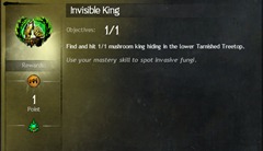 You will need Nuhoch Stealth Detection for this (Nuhoch Lore IV). Go east from the waypoint and drop down all the way to the jungle floor. You will see named Mushroom called Mushroom King Tyranus roaming around. He is invisible unless you have the mastery and he will not attack you. Just attack him once to get the achievement.
