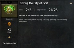 You will need to successfully complete the Octovine phase of the meta event 100 times. The best way is to use theHoT map timer to figure out when the Octovine phase occurs, taxi to a good map via the LFG tool a few minutes before that. If you need lots of Aurillium or any of the achievements for each of the individual lanes I would recommend starting on the east lane, and then rotate counterclockwise (east –> north –> west –> south). You want to participate in the burn/vulnerable phase at least once in each lane. East lane is usually the easiest, with south usually taking the longest. You get the title The Golden Child if you complete this achievement.