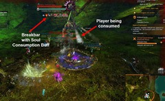 You have 10 minutes to defeat Vinetooth Prime before the event fails. The main thing with Vinetooth Prime is thebreakbars. He will jump around and then down a player. He will then try to consume this downed player. During this consume process his breakbars are active. You need to break Vinetooth Prime’s breakbars before he finish the consume or he will gain a stack of Soul Consumption that makes him deal more damage per stack. Crowd control abilities are very important for this fight. If he keeps gaining stacks due to failed breakbars, he will deal more and more damage, causing more players to get downed and you will basically fail the event due to the timer running out.