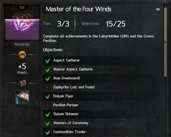 For this meta achievement you need to complete all 25 of Festival of the Four Winds achievement and Crown Pavilion achievements (except for the hidden achievements and Queen’s Gauntlet achievements).It will reward you with your choice of Sun, Lightning, or Wind Blessed Zephyrite Gloves (unlock one armor weight does not unlock for all). However, you can also make the other versions with the following recipe: Sun/Lightning/Wind Touched Zephyrite Gloves (buy from TP) , 250 Quartz Crystals, 5 Charged Quartz Crystals, 20 Elonian Wine.