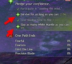 These two achievements can be done together and can be only done solo as players that are the not the owner instance can’t participate. You basically need to survive for 5 minutes and kill 50 White Mantle mobs. First two waves are relatively easy but the third wave and onwards get much harder. Each wave spawn 10 mobs. You can get downed but if you get killed both achievement fails. You can use the thingie on the top right to keep track of time/mobs.